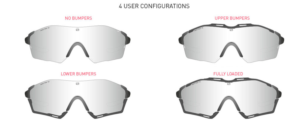 את הבאמפרים של ה- Cutline ניתן להרכיב בארבעה מצבים בהתאם לצרכים השונים של הרוכבים ולשיפור ההגנה על הפנים –